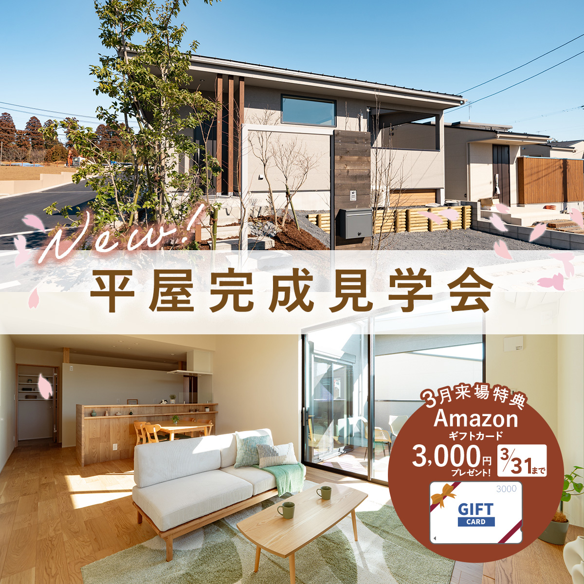 (1)ついに完成♪完成したばかりの平屋見学ができます! (2)3月中のご来場特典!今なら3,000円分のギフトカードプレゼント! 【その他内容】 ・平屋の暮らしやすさ、特徴についてご説明 ・平屋の街並み、ご見学 ・その他来場者様限定情報公開 お客様のご希望に沿って、丁寧にご対応させていただきます。