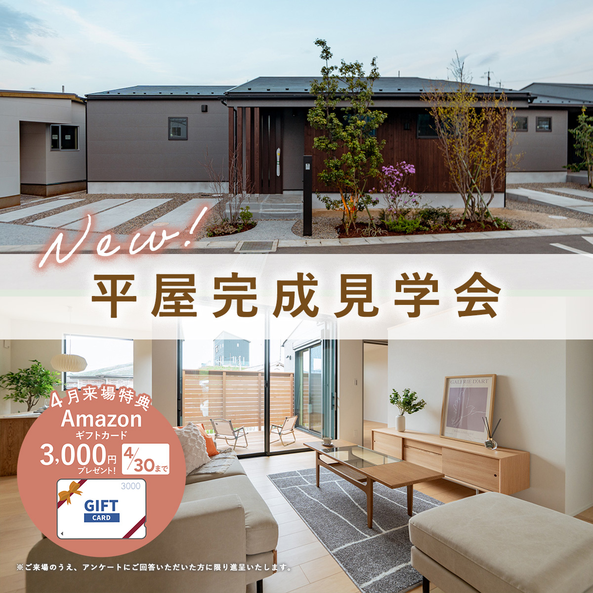 (1)ついに完成♪完成したばかりの平屋見学ができます! (2)4月中のご来場特典!今なら3,000円分のギフトカードプレゼント! ※ご来場のうえ、アンケートにご回答いただいた方に限り進呈いたします。 【その他内容】 ・平屋の暮らしやすさ、特徴についてご説明 ・平屋の街並み、ご見学 ・その他来場者様限定情報公開 お客様のご希望に沿って、丁寧にご対応させていただきます。