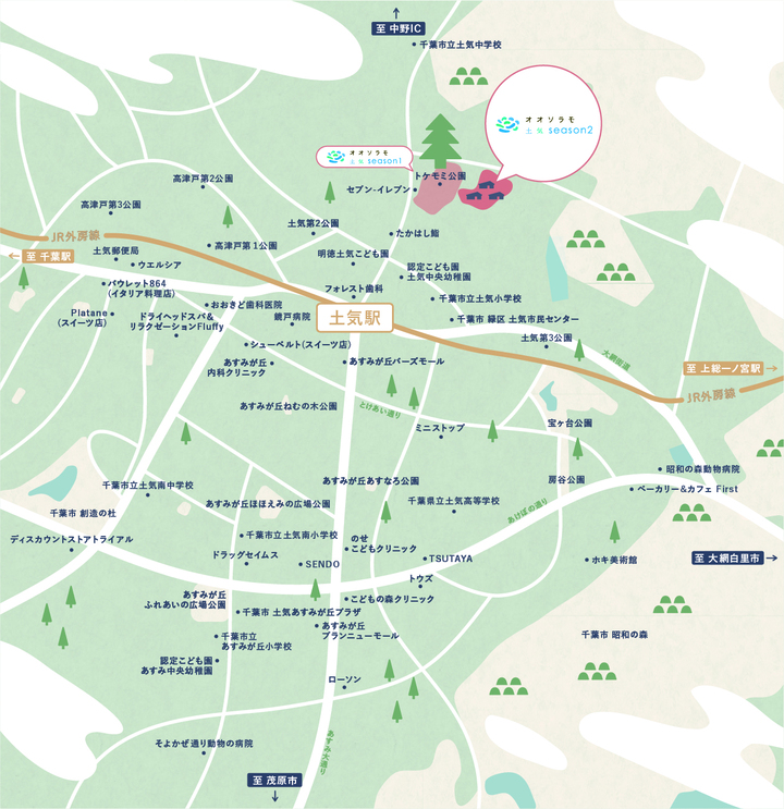JR土気駅から徒歩9分。通勤も通学も安心の距離で、東京駅へは乗り換えなしの快適アクセス。家族の毎日を支える便利な立地です。