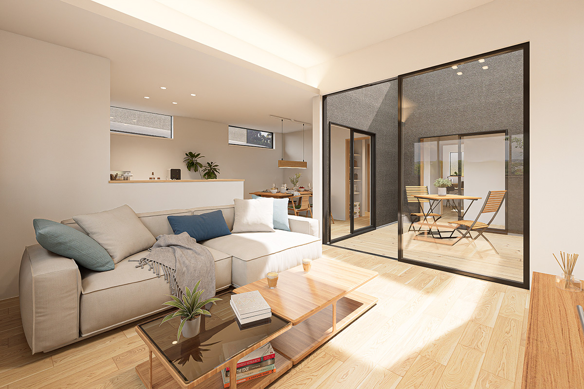 やわらかな朝陽が、庭からリビングへとゆっくり差し込みます。